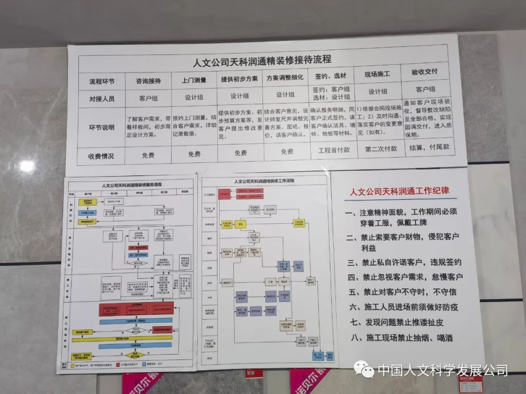 建立公示制度、增强透明度。在家装过程中,总会遇到像是更换材料、工艺不过关、增项漏项、装修不规范、拖延工期等各种各样的装修风险,这些都是业主最关心也是最担心的问题。为此,在入驻社科嘉园项目之初,天科润通就明确了工作纪律、装修接待流程、服务流程、工序流程,并将安全生产许可证等资质证书在显著位置公示,特别是将包含有总负责人、设计组、施工组、质量安全组以及材料组在内的所有工作人员信息和联系方式向客户进行了公开,切实做到了将标准化和透明化融入到为客户服务的全流程,明确规范、责任到人、公开承诺,消除业主在选择家装公司以及装修过程中的顾虑,实打实的为业主做好服务。